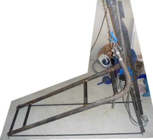 Wie man sieht, habe ich einfach den Autoträger umgedreht, spare mir komplett die Kippsicherung am Ende des Trägers und habe die Seile durch massiven Flachbandstahl ersetzt. Die Kippsicherung braucht man eigentlich nicht, wenn man das Auto nicht bis an die Grenze zum Umkippen (also über den Schwerpunkt hinaus) ankippt. 2 Tonnen oder mehr fallen meist nicht sooo einfach um, wenn der Schwerpunkt noch auf der richtigen Seite ist. Der Läufer ist bei mir jetzt einfach das Dreieck der gebogenen Enden, aufgrund der Winkelverschiebung beim Hochkurbeln (siehe Bild 1) läuft das Dreieck automatisch am Steher hoch und kann nicht seitlich wegrutschen. Auch das Kippmoment des Stehers in Richtung Kfz beim Hochkurbeln wird auf diese Weise vollkommen eliminiert. Zerlegbar ist mein Heber in 4 lange und einigermassen gleichschwere Teile (2 Flachbandstahlstangen, der Kfz-Träger, der Steher) und den Kleinkram (Flaschenzug, Gewindestangen, Ketten etc.) und ist somit auch einigermassen transportabel.