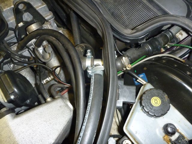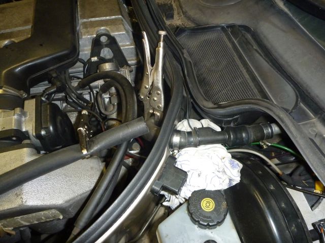 Erstmal ein Paar Klemmzangen holen, um den Original-Wasserschlauch abzuklemmen. Dann kann man ihn durchschneiden ohne dass der halbe Kühlkreislauf leerläuft. Im Bild der Anschluß der Rücklaufleitung vom Verdampfer direkt an die Rücklaufleitung des Heizkreislaufs NACH den Ventilen in der Nähe der Batterie. Man tut sich auch erheblich leichter, wenn man den Luftfilterkasten ausbaut (eine Schraube links oben hinter dem Wischwasserbehälter, dann den Kasten einfach nach oben abziehen). Und viele Lappen drunter, das Kühlwasser muss ja nicht die Lichtmaschine fluten, ihr wisst ja Strom -- Wasser, verträgt sich nicht so ;-)